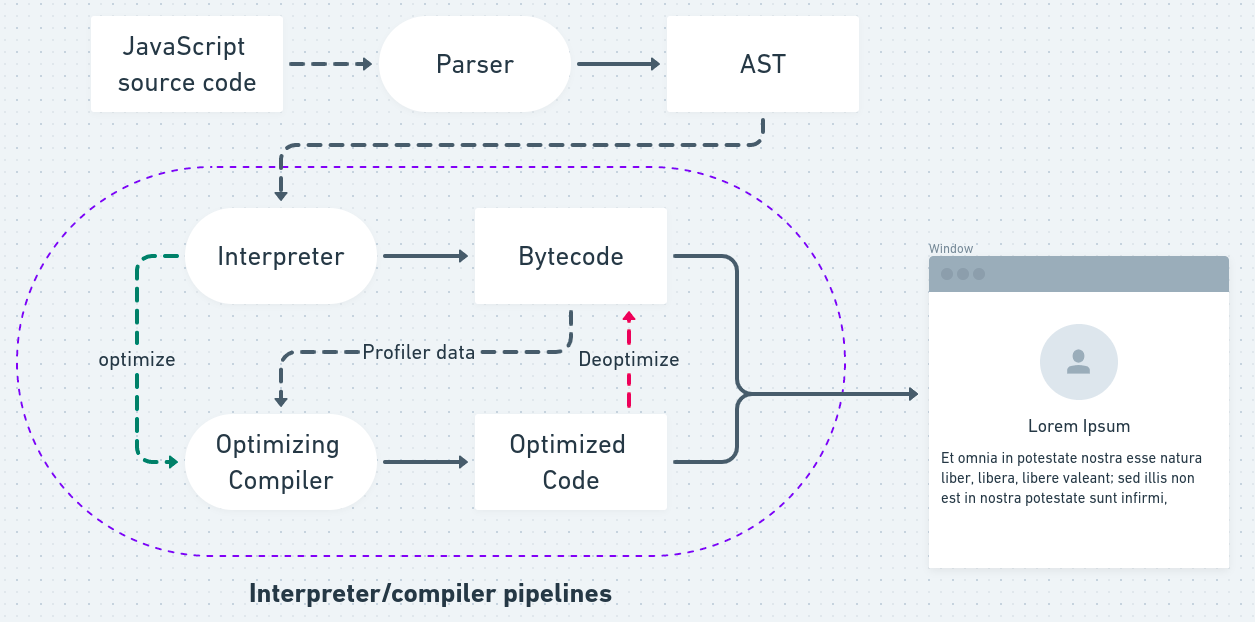 세미 인터프리터라는 말은 내가 붙인 이름이지만 필요에 따라 컴파일 과정을 거쳐 자바스크립트 실행 성능을 높이는 방식을 사용한다.